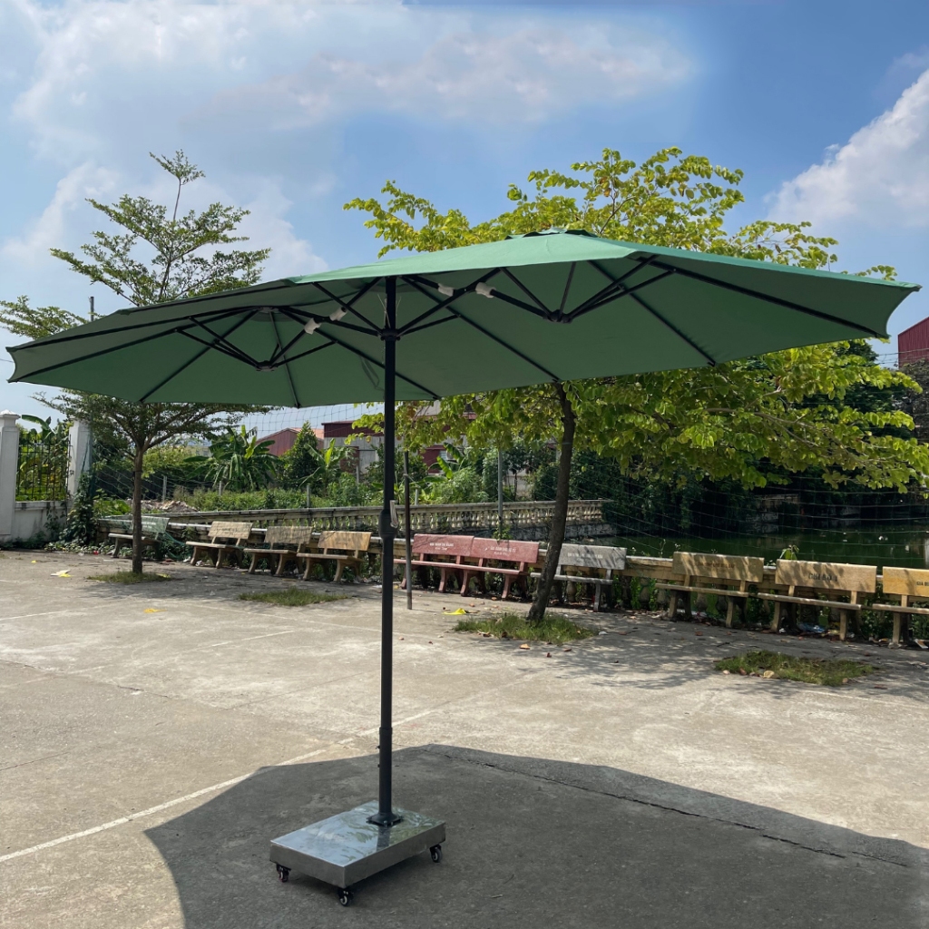Dù cỡ lớn không chỉ che nắng mà còn giảm nhiệt, hạn chế tia UV, chống mưa nhẹ và tạo không gian đồng bộ, chuyên nghiệp cho khu vực lắp đặt.
